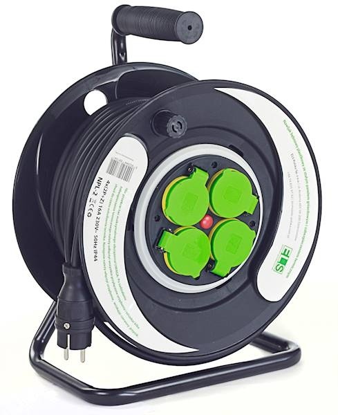 Przedłużacz zwijany jednofazowy na bębnie wykonany jest z bardzo wytrzymałego plastiku. Wbudowany wyłącznik termiczny 16A chroni przed przegrzaniem i uszkodzeniem urządzenia. Przedłużacz wykonany jest w stopniu szczelności IP44, posiada klapki ochronne na gniazdach.