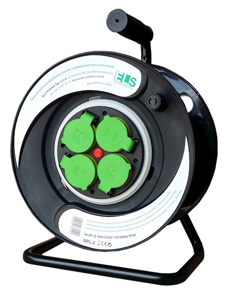 Przedłużacz zwijany jednofazowy na bębnie wykonany jest z bardzo wytrzymałego plastiku. Wbudowany wyłącznik termiczny 16A chroni przed przegrzaniem i uszkodzeniem urządzenia. Przedłużacz wykonany jest w stopniu szczelności IP44, posiada klapki ochronne na gniazdach.