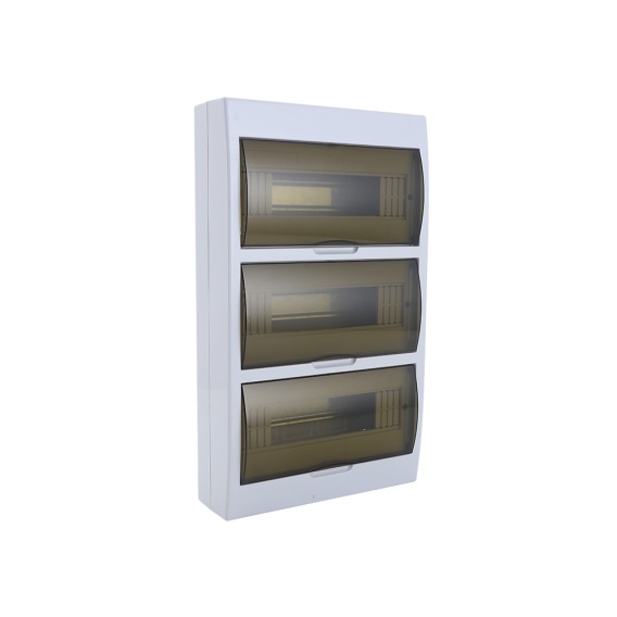 Obudowa w kolorze szarym wyposażona jest w przyciemniane (zadymione) przezroczyste drzwiczki, które umożliwiają kontrolę stanu aparatury bez konieczności otwierania rozdzielnicy, jednocześnie ograniczając widoczność wnętrza i poprawiając estetykę instalacji.