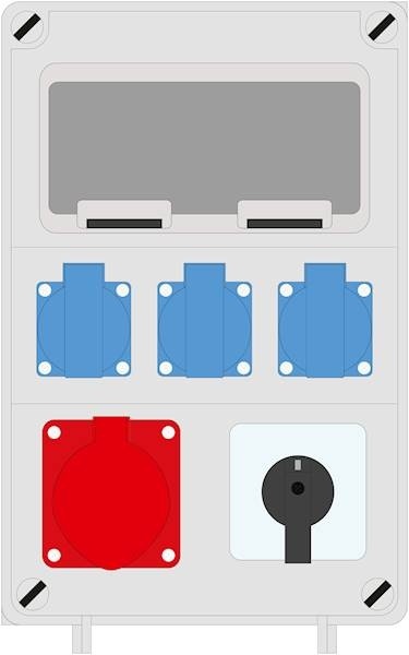 - gniazdo jednofazowe: 3x 16A 3P (2P+Z) 230V IP44